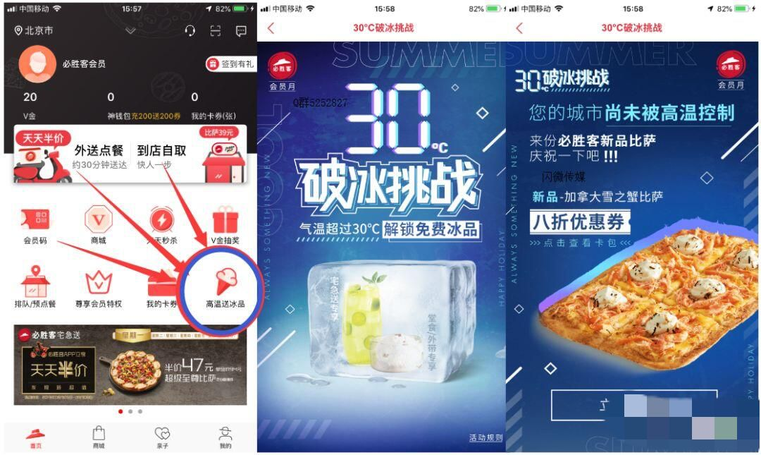 必胜客app免费领 外卖可用的卡曼橘茶以及堂食可用的单球冰激凌 薅羊毛 19年8月12日 编辑 爱羊毛 取消关注 关注 私信 必胜客 app ,首页,高温送冰品,所在城市气温超过30度,即可免费领 外卖可用的卡曼橘茶以及堂食可用的单球冰激凌(任意消费)每天一次。