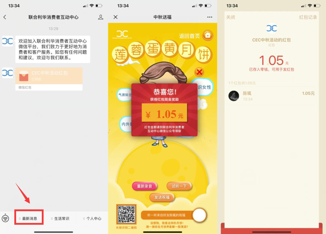 微信关注公众号“联合利华消费者互动中心”抽红包 薅羊毛 19年9月11日 编辑 爱羊毛 取消关注 关注 私信 微信关注公众号“联合利华消费者互动中心”->菜单栏点“最新消息”中秋送福 进入玩游戏->玩一把结束后下方录音两秒钟 然后随便发送给好友->即可领取红包 亲测中1.05秒到!